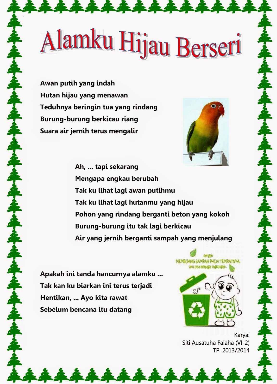 Contoh sajak sunda tentang alam dan lingkungan yang sudah rusak. Sajak bahasa sunda tentang lingkungan sekolah. Bentuk sajak adalah bebas tidak tertakluk kepada jumlah perkataan atau suku kata dan tidak mempunyai imbangan bunyi yang tetap. Untuk belajar kosakata sunda silakan lihat kamus sunda indonesia lengkap dan translate basa sunda lemes. Pengen minta contoh sajak bahasa sunda tapi buatan sendiri tentang alam ya tolong dibantu jangan dr internet jangan nyolong diinternet ya. Tempat kahiji kuring neangan élmu tempatna kuring nyiar élmu sakola.